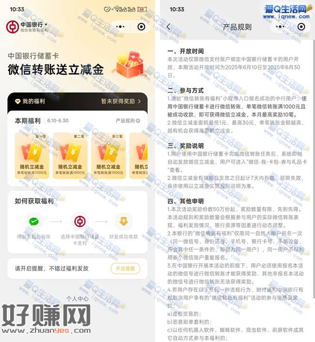 微信打开下方地址 报名 参与活动 中行借记卡进行微信转账成功后可以领微信立减金 最多可以参与4次