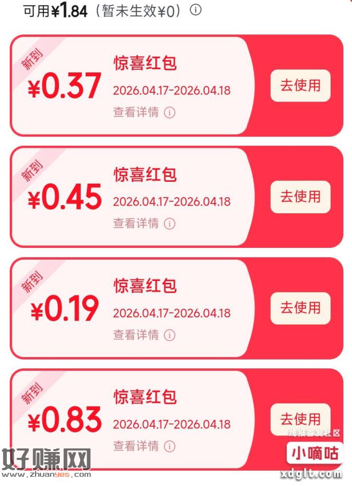 京东赚红包好像有水,平常我都是0.1的,现在第一个0.83, 2026-4-17 11:30 | 1 | 0 | 线报 41 字 | 几秒读完 京东赚红包好像有水,平常我都是0.1的,现在第一个0.83,吓得我赶紧做任务多抽几次